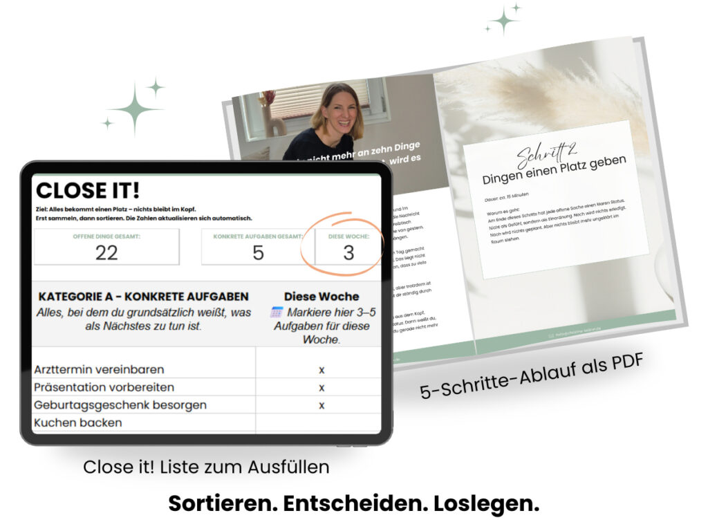Daraus ist Close it! ist entstanden – es ist kein Coaching und auch kein neues System, sondern einfach ein klarer Ablauf, mit dem ich einmal alles aus dem Kopf hole und entscheide, was wirklich dran ist.
